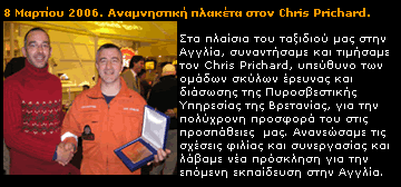 Στα πλαίσια του εκπαιδευτικού ταξιδιού μας, στην Αγγλία, συναντήσαμε και τιμήσαμε τον Chris Prichard, υπεύθυνο των ομάδων σκύλων έρευνας και διάσωσης της Πυροσβεστικής Υπηρεσίας της Βρετανίας, για την πολύχρονη προσφορά του στις προσπάθειες μας. Η συνάντηση έγινε στην διάρκεια του CRUFTS 2006, στο Birmingham, όπου η ομάδα τους παρουσίαζε το έργο τους, στο περίπτερο του χορηγού της. Ανανεώσαμε τις σχέσεις φιλίας και συνεργασίας και λάβαμε νέα πρόσκληση για την επόμενη μας εκπαίδευση στην Αγγλία