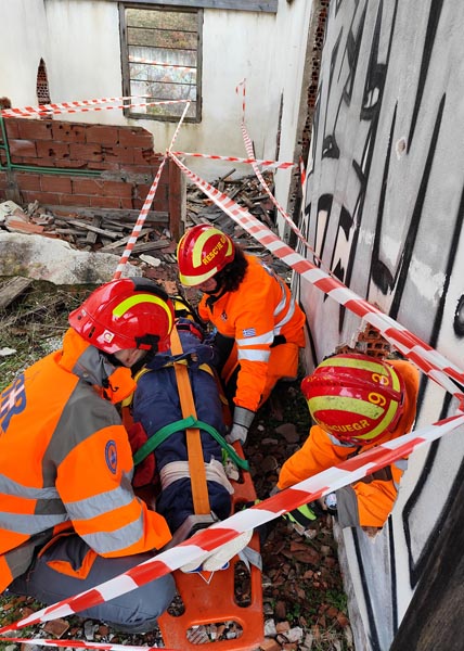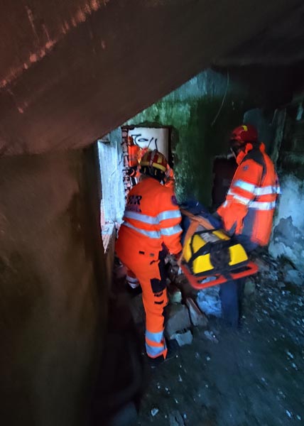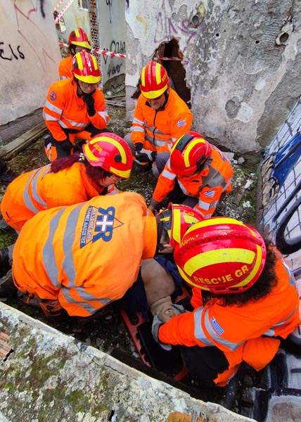 Στη συνέχεια, πραγματοποιήθηκε οργανωμένη μεταφορά του τραυματία μέσα από ιδιαίτερα στενούς και δύσκολους διαδρόμους ερειπίων, μέχρι το σημείο ασφαλούς παράδοσης.